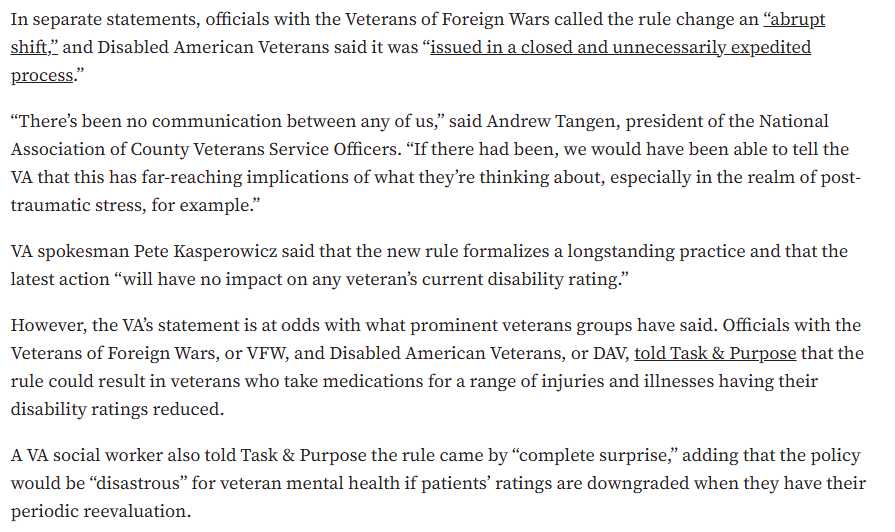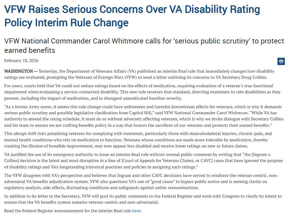 This new regulation effective 2/17/2026 represents a direct administrative maneuver to IGNORE a 2025 Ingram v. Collins decision by the U.S. Court of Appeals for Veterans Claims, which had reaffirmed a long-standing legal principle that veterans should be rated based on their underlying disability severity. While the court in Ingram—and previously in Jones v. Shinseki—ruled that the VA must "discount" the temporary relief provided by medication to find a veteran's true baseline of impairment, this new rule explicitly mandates that examiners evaluate only a veteran's "medicated state." This basically reaffirmed a prior court ruling so ...